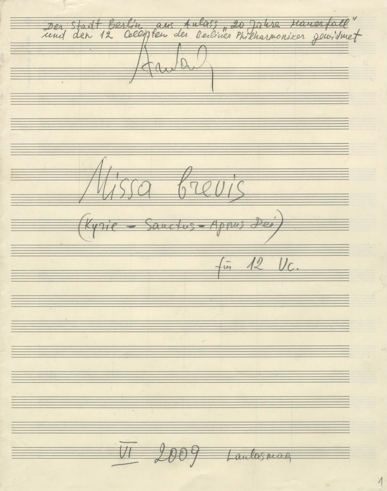 Missa brevis (Latin for ‘short Mass’) was completed in 2009 for the twelve violoncellists of the Berlin Philharmonics to celebrate the 20th anniversary of the fall of the Berlin Wall. The piece was commissioned for a series of six concerts at the Konzerthaus Berlin, which were to include premieres of new works by six composers.